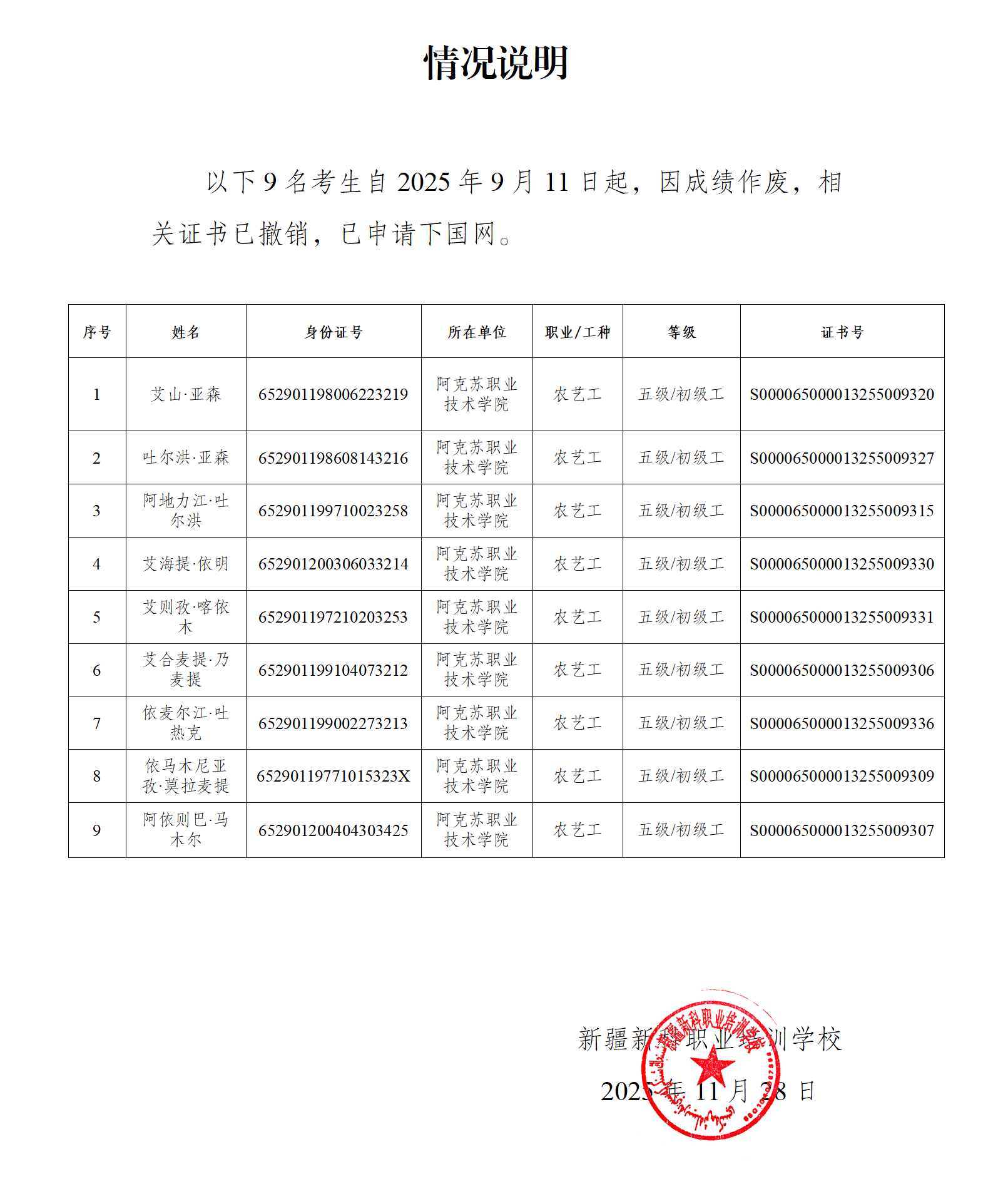 关于艾山·亚森等9人职业技能等级评价证书退网情况说明