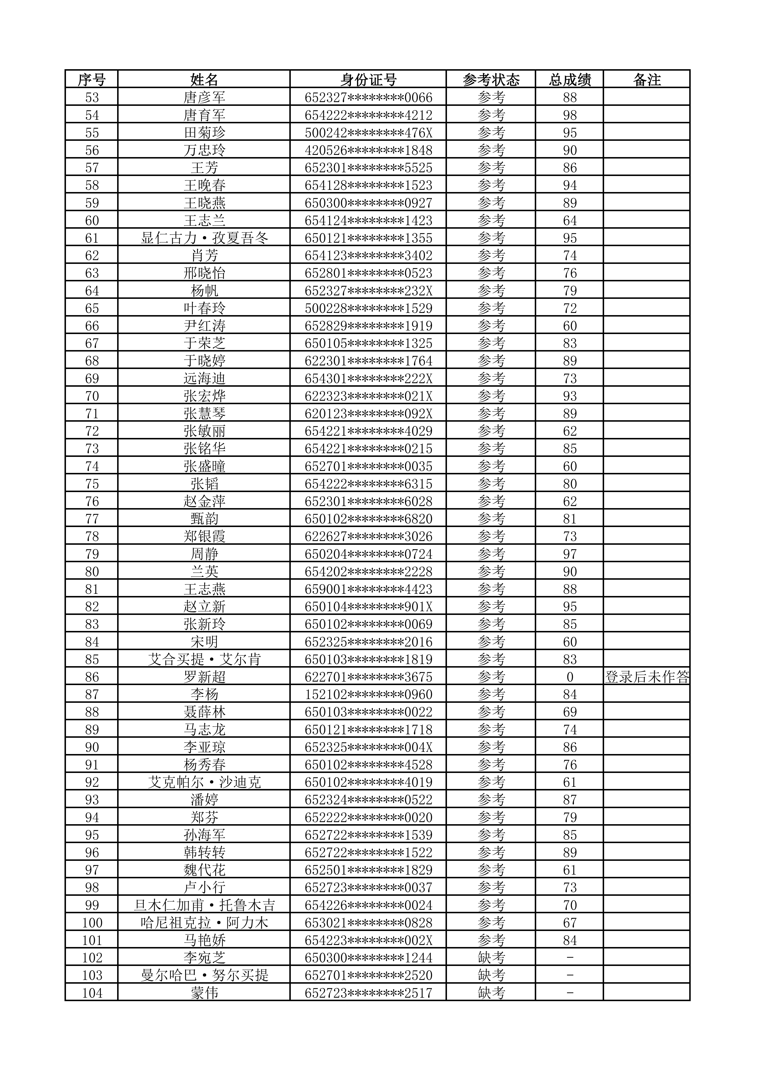 现将本次考试成绩予以公示,接受全体考生及社会监督
