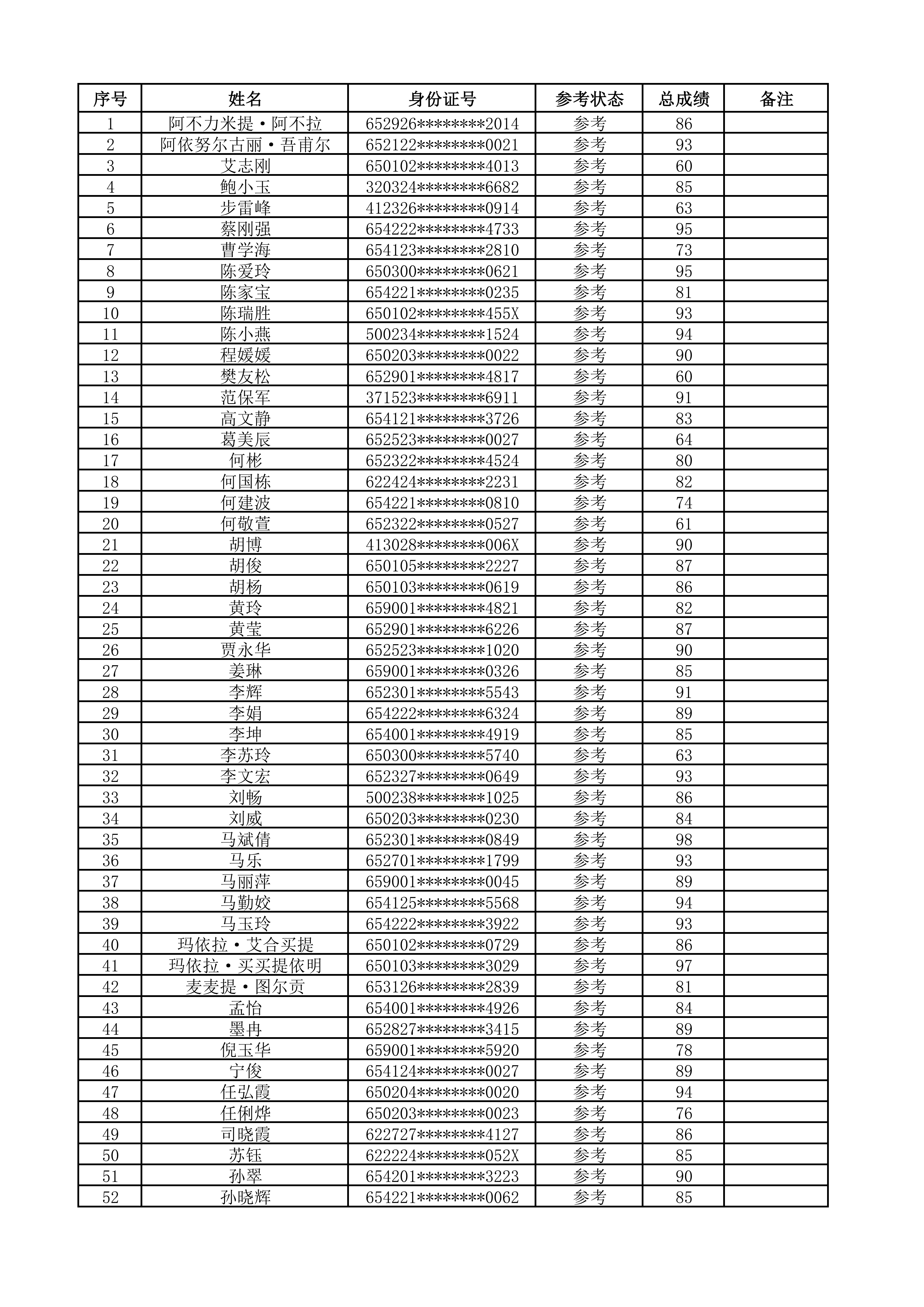 现将本次考试成绩予以公示,接受全体考生及社会监督